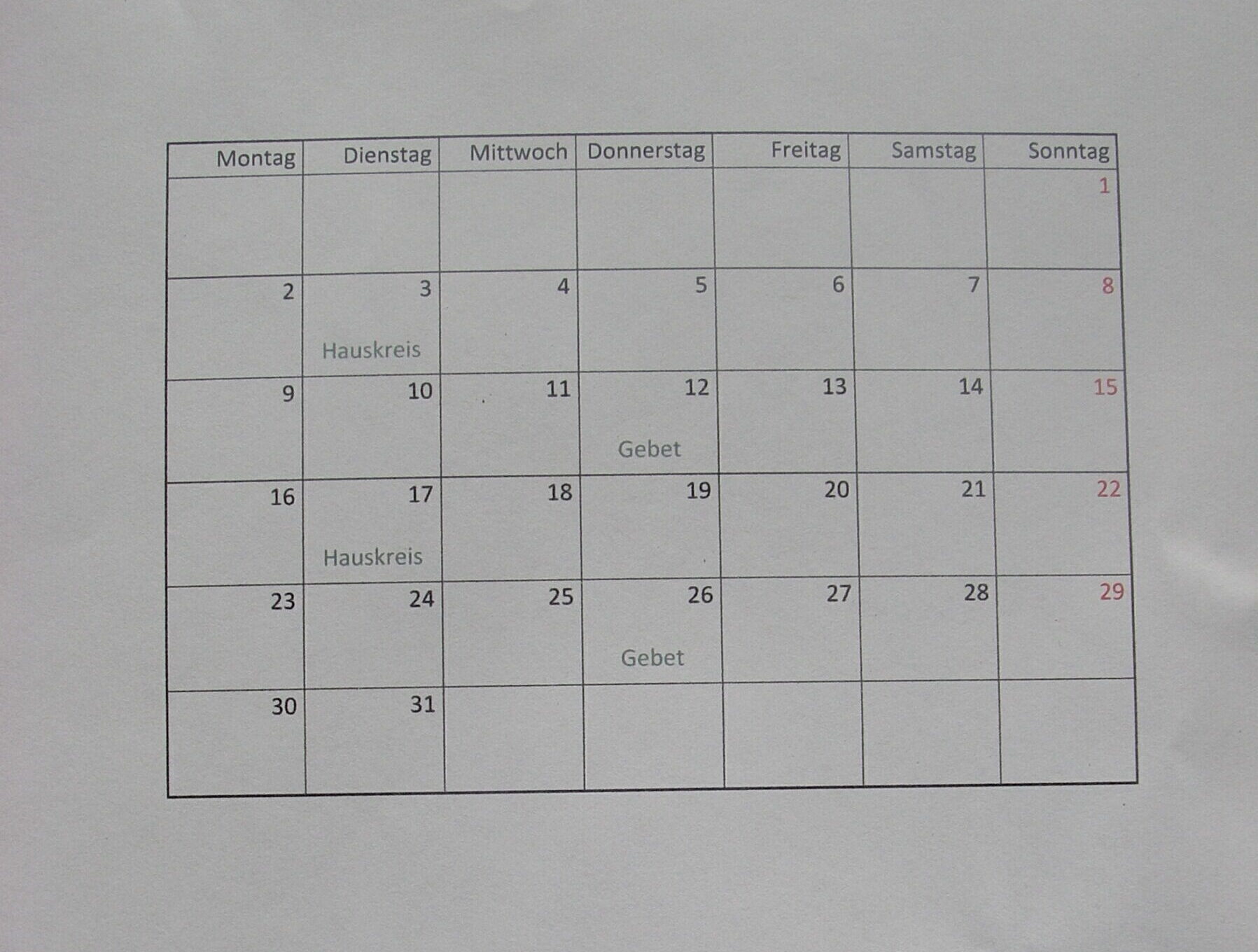 Wöchentlich findet entweder die Gebetsstunde oder Hauskreise statt.